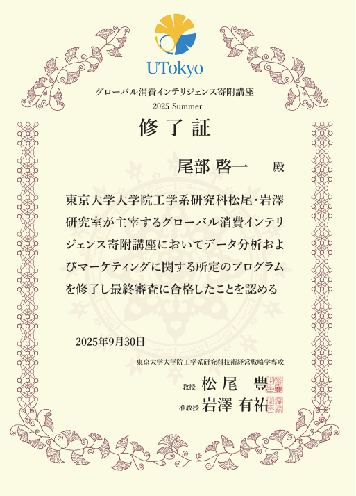 実務を通じて会計分野でのAI活用の遅れを感じ、自らがAIを学ぶため、2025年に日本のAI研究の最先端の東京大学松尾研のプログラムに参加し修了認定を受ける。継続して松尾研のAIコミュニティで学びを続けている。
