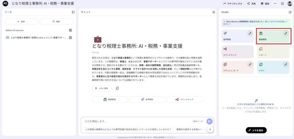 ソースとしてURLが追加されると、画面右部に操作メニューが表示されます。その中から「動画解説」をクリックしてください。
