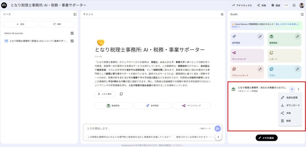 「となり税理士事務所」では、税務・会計のサポートはもちろんのこと、顧問先の皆様の業務効率化や生産性向上に繋がる情報提供にも力を入れています。ぜひこの機会に、NotebookLMを試してみてはいかがでしょうか。未来のコンテンツ制作の形が、ここにあるのかもしれません。