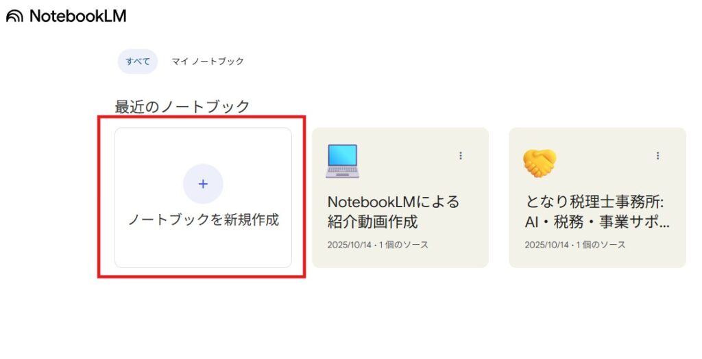 まず、NotebookLMを開き、左側にある「+ノートブックを新規作成」をクリックします。
