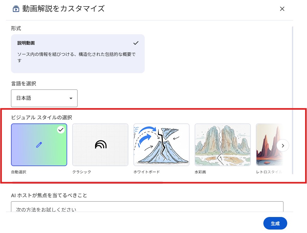 動画のスタイルは「動画解説」右上の🖊マークをクリックし、動画解説をカスタマイズ画面の「ビジュアルスタイルの選択」でスタイルをカスタマイズできます。