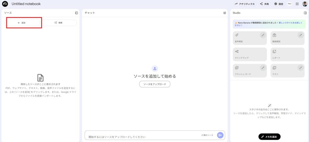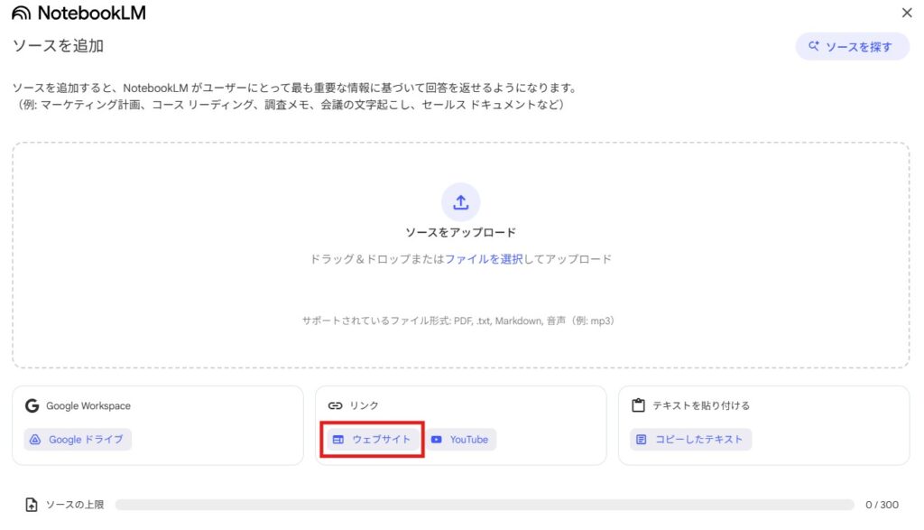 次に、ノートブックが開いたら、「ソース」セクションの「+追加」をクリックし、「ウェブサイト」を選択します。